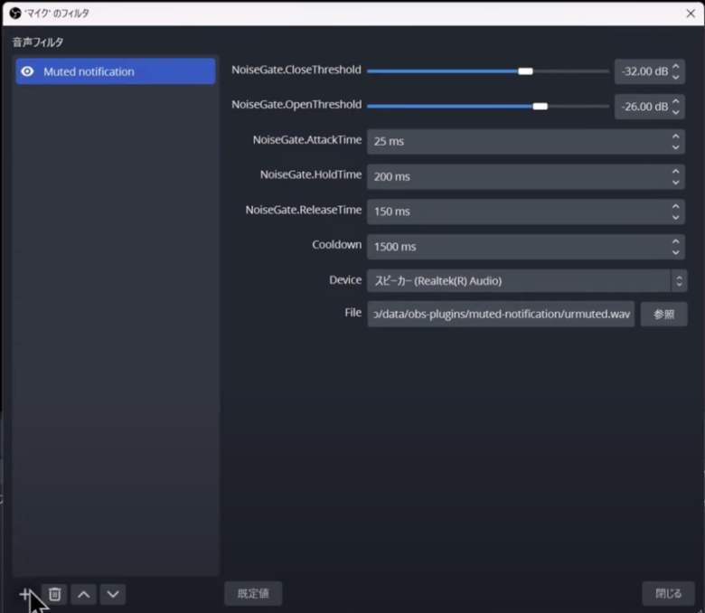 OBSを開き、音声フィルタから「Muted Notification」を選択します。