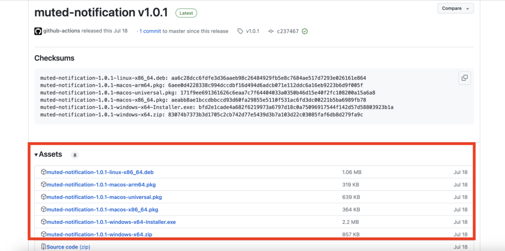 GitHubのページに飛びますので、赤枠部分「Assets」からOSにあったインストーラーを選択してインストールするようにしましょう。